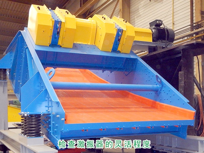 檢查激振器的靈活程度,用手轉(zhuǎn)動(dòng)皮帶輪使偏心塊脫離平衡位置后,應(yīng)出現(xiàn)數(shù)次自由擺動(dòng),如篩子到貨后時(shí)間超過半年后才安裝,激振器應(yīng)全部拆下重新清洗加油。