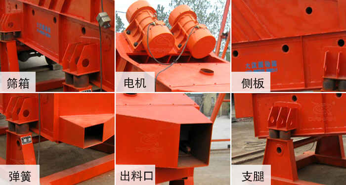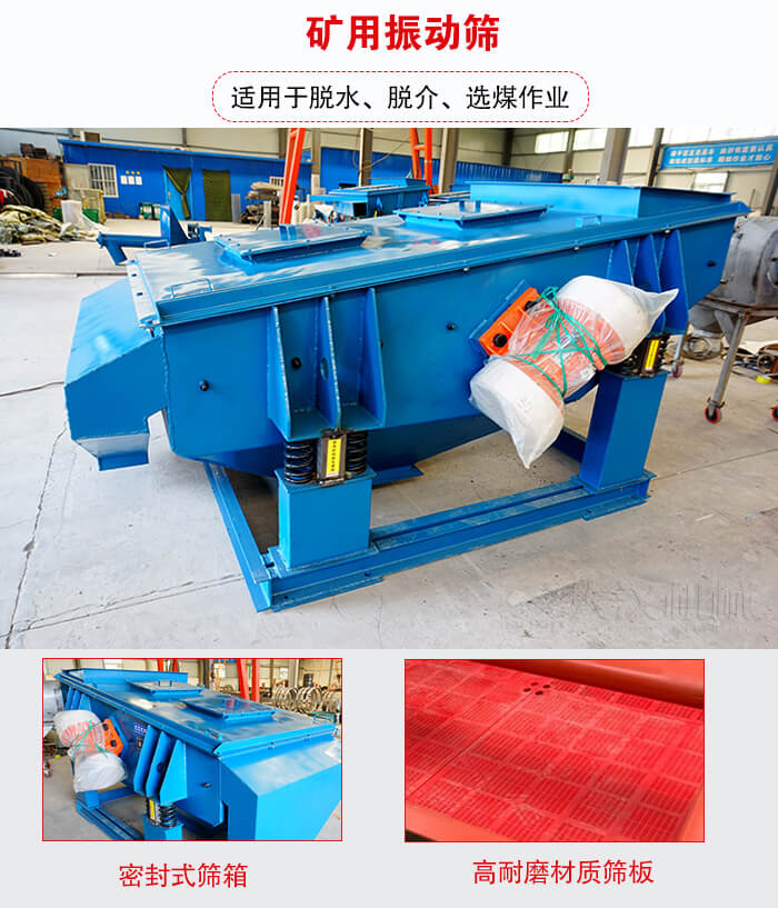 礦用振動篩采用振動電機做激振源、橡膠彈簧裝置支撐并隔振、高耐磨材質篩板、密封式篩箱等