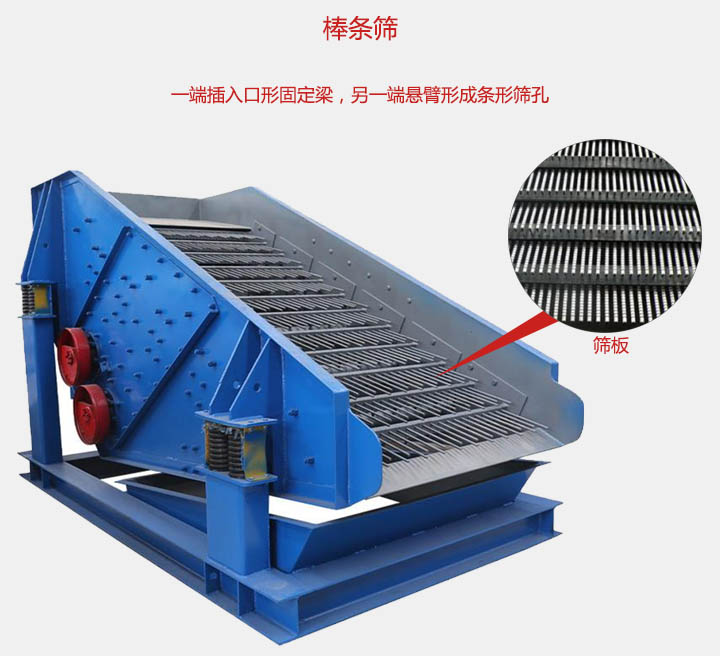 棒條篩篩面是由一組相互平行的彈簧棒條和安裝棒條的固定梁等組成的,鋼棒采用65Mn,55CrSi,60SiMn等彈簧鋼,一段插入口形固定梁,另一端懸臂形成條形篩孔,棒條的長(zhǎng)度設(shè)計(jì)在220-360mm之間。該設(shè)備主要適用于破碎機(jī)前大塊物料的均勻給料,以及垃圾的篩分處理等行業(yè)中。